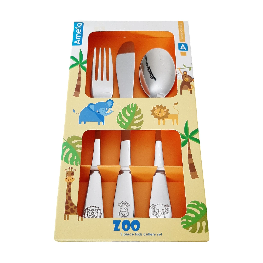 De Amefa Jungle Vriendjes kinderbestekset maakt van elke maaltijd een mini‑safari. De set bestaat uit een vork met een dappere leeuw, een mes met een vriendelijke giraf en een lepel met een schattig olifantje. De dierfiguren geven het bestek een speelse en uitnodigende uitstraling.