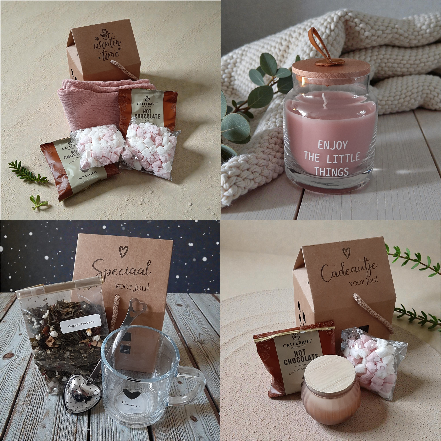 - “Candlelight” Een sfeervol kaarsje, met een zakje heerlijke callebaut chocolade voor een kopje lekkere warme chocomel en een zakje mini marshmallows om het geheel af te maken.
