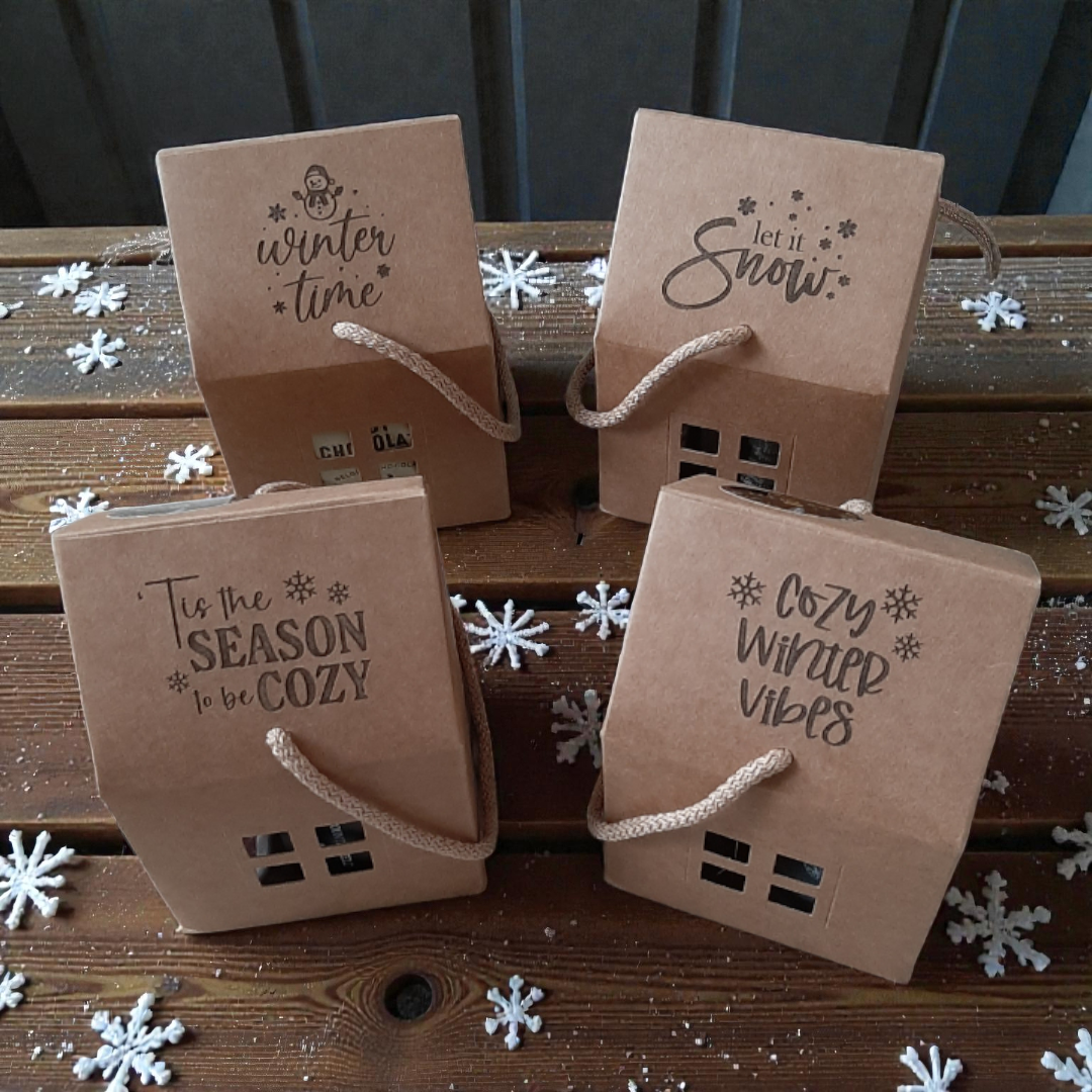 Doosjes (10 x 10 x 15 cm) zijn verkrijgbaar met de volgende teksten: