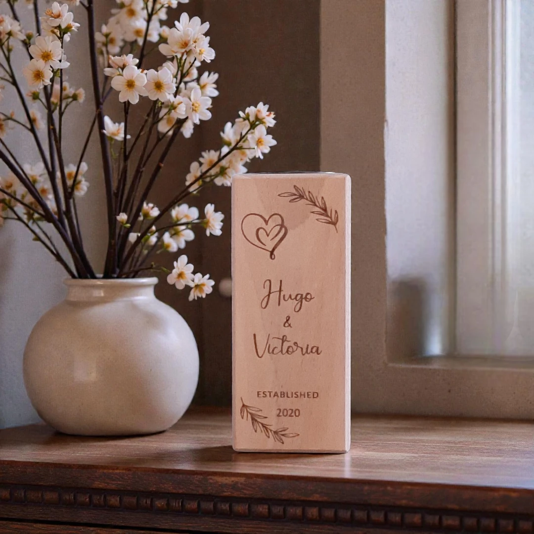Door middel van een waxinelichthouder graveren is dit een prachtig en persoonlijk cadeau voor koppels die hun liefde willen vieren. De houder wordt voorzien van beide namen en het jaar waarin hun relatie begon, weergegeven in de stijlvolle tekst “Established 20..”. Een blijvende herinnering aan het moment waarop hun gezamenlijke avontuur begon.
